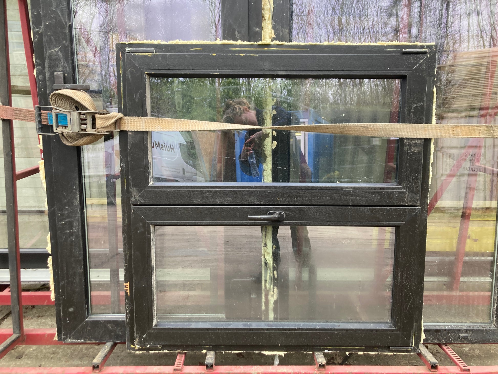 PVC raam zwart, met houtnerven-look.
