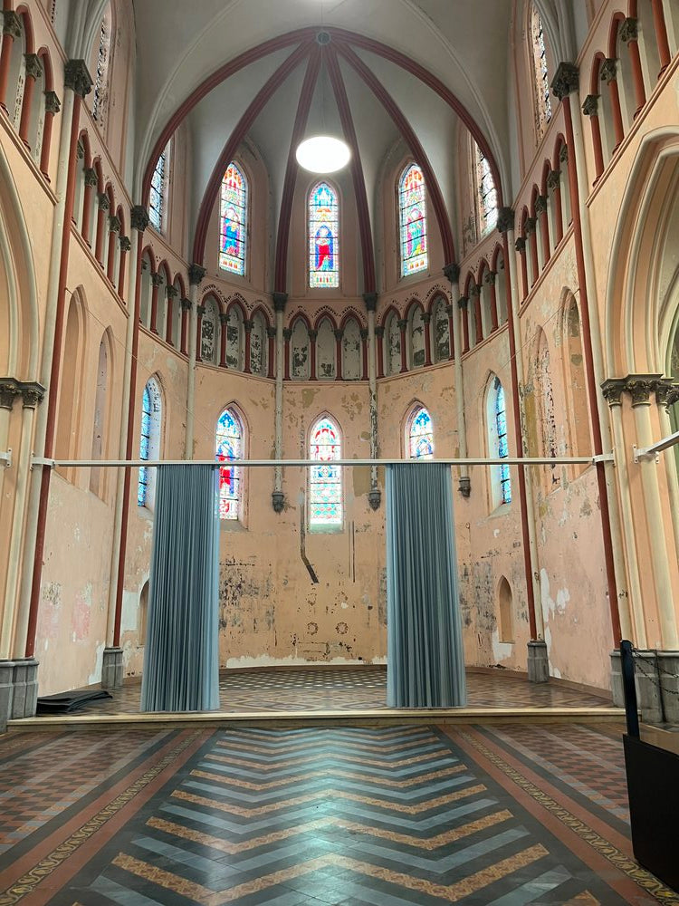 Cementtegels kleuren: rood, geel, blauw, donkerblauwzwart, komende uit 'Heilig Hartkerk' te Sint-Amanstberg. De kleuren zijn niet oppervalkkig maar zijn over het gehele volume van de cementtegels gekleurd, wat vrij uniek is.